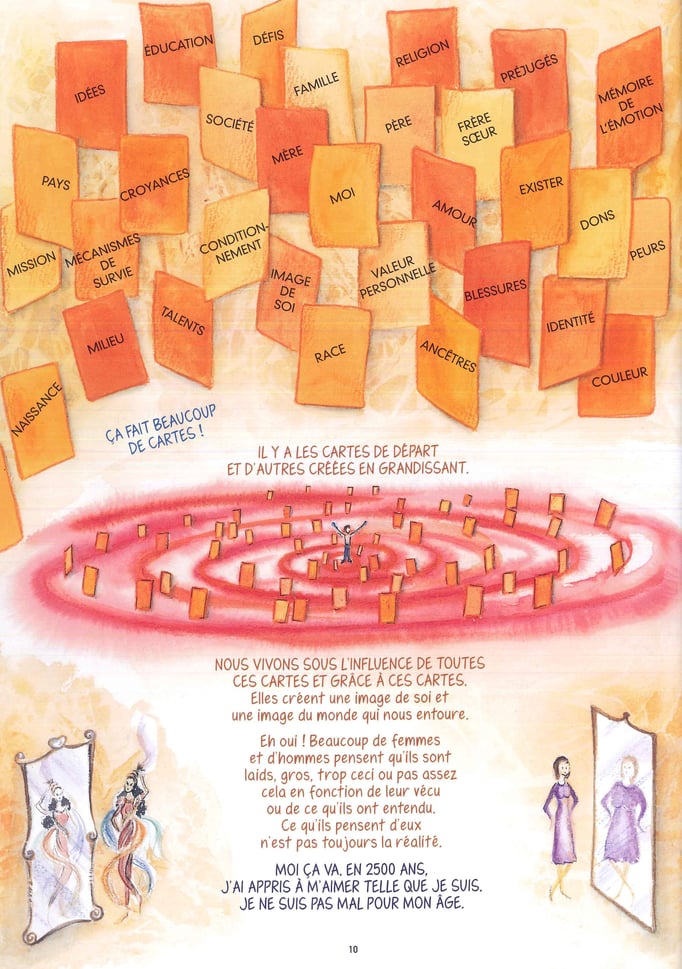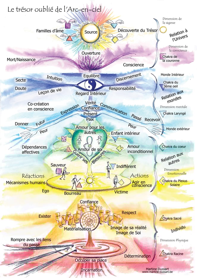 Cette aventure est structurée. Elle a pour fil conducteur nos quatre dimensions : physique avec le rouge et l'orange, émotionnelle avec le jaune et le vert, mentale avec le bleu et l'indigo et spirituelle avec le violet et le blanc.
